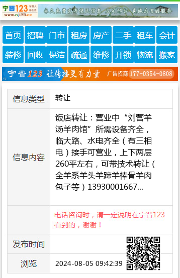饭店转让:营业中“刘营羊汤羊肉馆”所需设备齐全,临大路、水电齐全(有三相电)接手可营业,上下两层260平左右,可带技术转让(全羊系羊头羊蹄羊棒骨羊肉包子等)13930001667