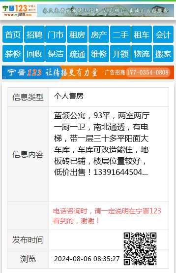 蓝领公寓,93平,两室两厅一厨一卫,南北通透,有电梯,带一层三十多平阳面大车库,车库可改造能住,地板砖已铺,楼层位置较好,低价出售!13391644504