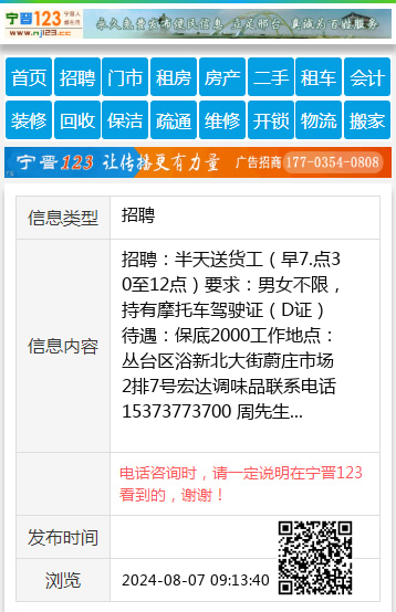 招聘:半天送货工(早7.点30至12点) 要求:男女不限,持有摩托车驾驶证(D证) 待遇:保底2000 工作地点:丛台区浴新北大街蔚庄市场2排7号宏达调味品 联系电话15373773700 周先生