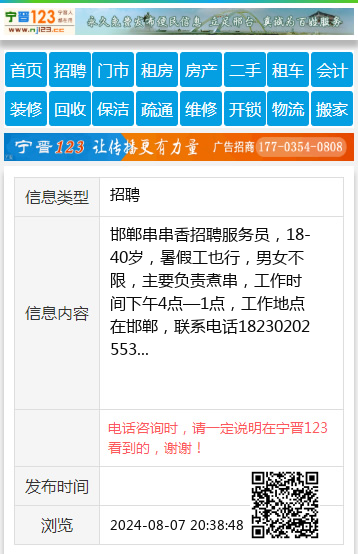 邯郸串串香招聘服务员,18-40岁,暑假工也行,男女不限,主要负责煮串,工作时间下午4点—1点,工作地点在邯郸,联系电话18230202553