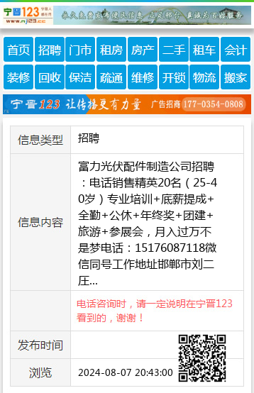 富力光伏配件制造公司招聘:电话销售精英20名(25-40岁)专业培训+底薪提成+全勤+公休+年终奖+团建+旅游+参展会,月入过万不是梦 电话:15176087118微信同号工作地址邯郸市刘二圧