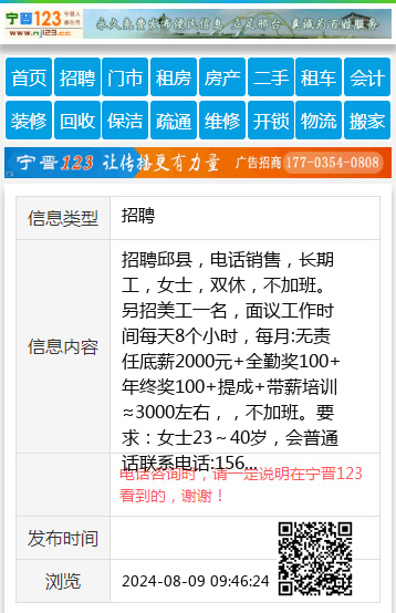 招聘邱县,电话销售,长期工,女士,双休,不加班。 另招美工一名,面议 工作时间每天8个小时,每月:无责任底薪2000元+全勤奖100+年终奖100+提成+带薪培训≈3000左右,,不加班。 要求:女士23~40岁,会普通话 联系电话:15630017246 工作地址:县城内