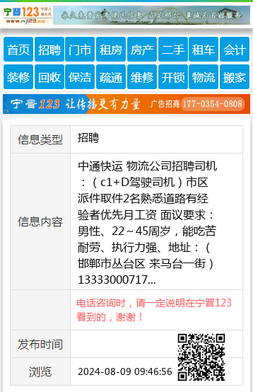 中通快运 物流公司 招聘司机:(c1+D驾驶司机)市区派件取件2名熟悉道路有经验者优先月工资 面议 要求:男性、22~45周岁,能吃苦耐劳、执行力强、 地址:(邯郸市丛台区 来马台一街)13333000717