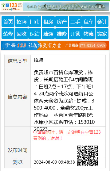 负责超市百货仓库理货,拣货,长期招聘 工作时间晚班:白班7点~17点,下午班14-24点两个班次可选 每月公休两天 薪资为底薪+提成,3500-4000,全勤奖200元 工作地点:丛台区青年路阳光水岸小区 联系电话:15301020623