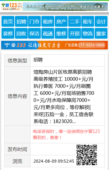 馆陶房山片区牧原高薪招聘 高级养殖技工 10000+元/月 执行兽医 7000+元/月 刷圈工 6000+元/月 现场销售7000+元/月 水电保障岗7000+元/月 更多岗位,等你解锁[来呀] 五险一金,员工宿舍 联系电话:18230205554/15531377857