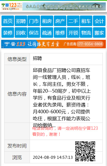邱县食品厂招聘 公司直招 车间一线管理人员, 线长,班长,车间主任。 男女不限, 年龄20--50周岁, 初中以上学历, 有食品行业及相关行业者 优先录用。 薪资待遇: 月4000-6000元, 公司提供吃住, 根据工作能力表现公司给 缴纳保险。 月休四天。15100342124