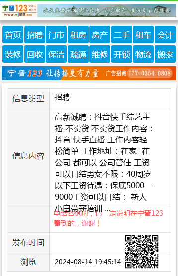 高薪诚聘:抖音快手综艺主播 不卖货 不卖货 工作内容:抖音 快手直播 工作内容轻松简单 工作地址:在家 在公司 都可以 公司管住 工资可以日结 男女不限:40周岁以下 工资待遇:保底5000—9000 工资可以日结: 新人小白带薪培训 运营一对一 15230088761