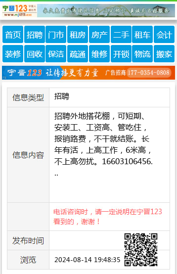 招聘外地搭花棚,可短期、安装工、工资高、管吃住,报销路费,不干就结账。长年有活,上高工作,6米高,不上高勿扰。16603106456