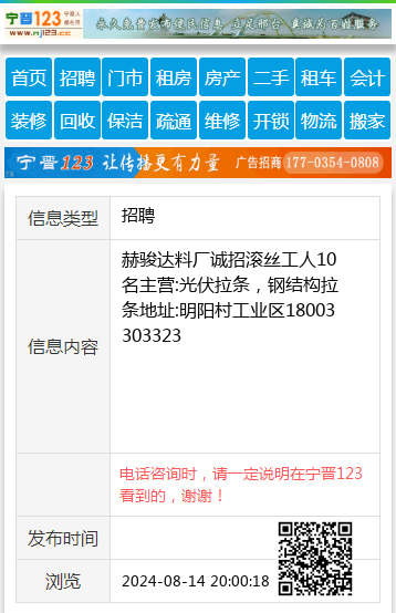 赫骏达料厂诚招滚丝工人10名 主营:光伏拉条,钢结构拉条 地址:明阳村工业区 18003303323