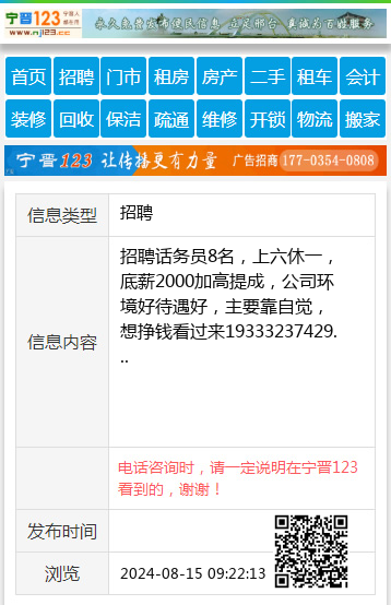 招聘话务员8名,上六休一,底薪2000加高提成,公司环境好待遇好,主要靠自觉,想挣钱看过来19333237429