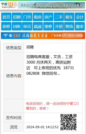 招聘电商客服,文员,工资3000 月休两天,高铁站附近 可上夜班的优先 18731082808 微信同号