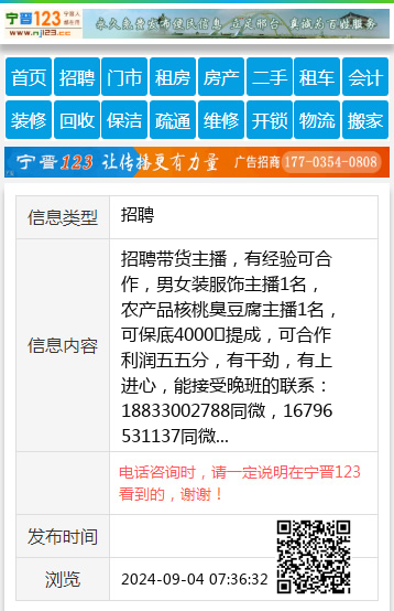 招聘带货主播,有经验可合作,男女装服饰主播1名,农产品核桃臭豆腐主播1名,可保底4000➕提成,可合作利润五五分,有干劲,有上进心,能接受晚班的联系:18833002788同微,16796531137同微