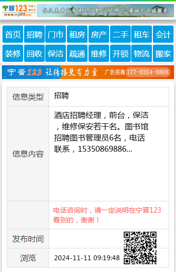 酒店招聘经理,前台,保洁,维修保安若干名。 图书馆招聘图书管理员6名,电话联系,15350869886