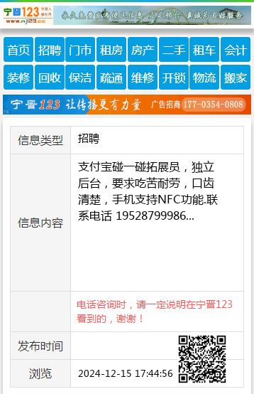 支付宝碰一碰拓展员,独立后台,要求吃苦耐劳,口齿清楚,手机支持NFC功能.联系电话 19528799986