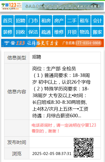 岗位:生产部 全检员 (1)普通岗要求:18-38周岁 初中以上,认识26个字母(2)特殊学历岗要求:18-38周岁 大专及以上▪时间:长白班或8:30-8:30两班倒、上4休2/次月上五休一▪工资待遇:月综合薪资6000-7500元、每月15号发薪日