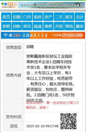 邯郸冀南新区林坛工业园区高新技术企业 1.招聘车间技术员1名,要求化学相关专业,大专及以上学历,有3年以上工作经验,吃苦耐劳,有责任心,服从领导安排。薪资面议,包吃住,缴纳保险。 2.招聘门岗1名,50岁到60岁之间。
