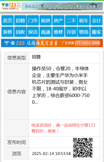 操作员50,仓管20,半导体企业,主要生产华为小米手机芯片的测试与封装,男女不限,18-40周岁,初中以上学历,综合薪资6000-7500