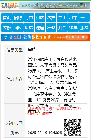 常年招聘库工,可直接过来面试。太平商贸(马头尚品冷库)。 库工要求: 1、按订单进冷库分拣货物,配合仓管出库。 2、负责仓库日常整理,入库,盘点,卸货,仓库卫生等。 3、冷冻食品,1件货品20斤,有电动地牛叉车协助。 4、未做过体力活,冷库工作,非诚勿扰!薪资:5-8K。