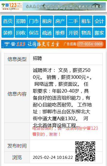 诚聘英才: 文员,薪资2500元。 销售,薪资3000元+。 网络运营,薪资面议。