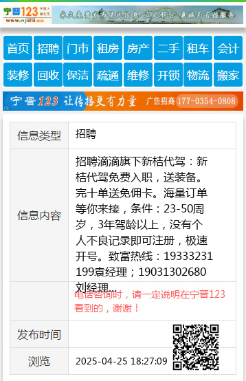 招聘滴滴旗下新桔代驾:新桔代驾免费入职,送装备。完十单送免佣卡。海量订单等你来接,条件:23-50周岁,3年驾龄以上,没有个人不良记录即可注册,极速开号。致富热线:19333231199袁经理;19031302680刘经理
