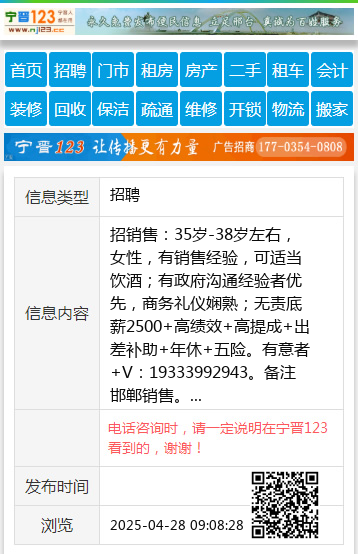 招销售:35岁-38岁左右,女性,有销售经验,可适当饮酒;有政府沟通经验者优先,商务礼仪娴熟;无责底薪2500+高绩效+高提成+出差补助+年休+五险。有意者+V:19333992943。备注邯郸销售。