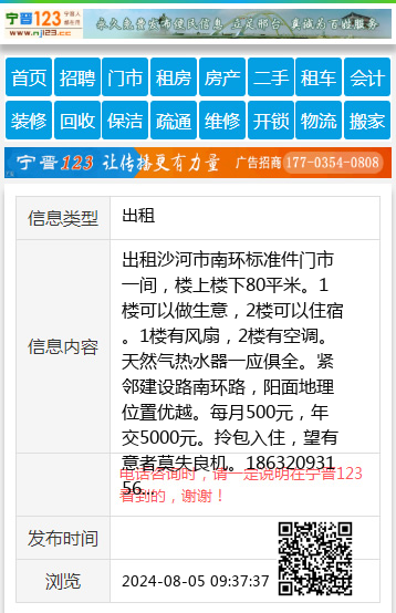 出租沙河市南环标准件门市一间,楼上楼下80平米。1楼可以做生意,2楼可以住宿。1楼有风扇,2楼有空调。天然气热水器一应俱全。紧邻建设路南环路,阳面地理位置优越。每月500元,年交5000元。拎包入住,望有意者莫失良机。18632093156